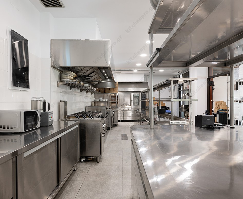 Όπως πάντα, οι ανοξείδωτες κατασκευές κατασκευάστηκαν από την KitchenPRO επί μέτρο, ειδικά για τους χώρους του πελάτη και σύμφωνα με τη μελέτη του χώρου, από ανοξείδωτο χάλυβα βαρέως τύπου AISI 304 πάχους 1,5 χιλιοστών.